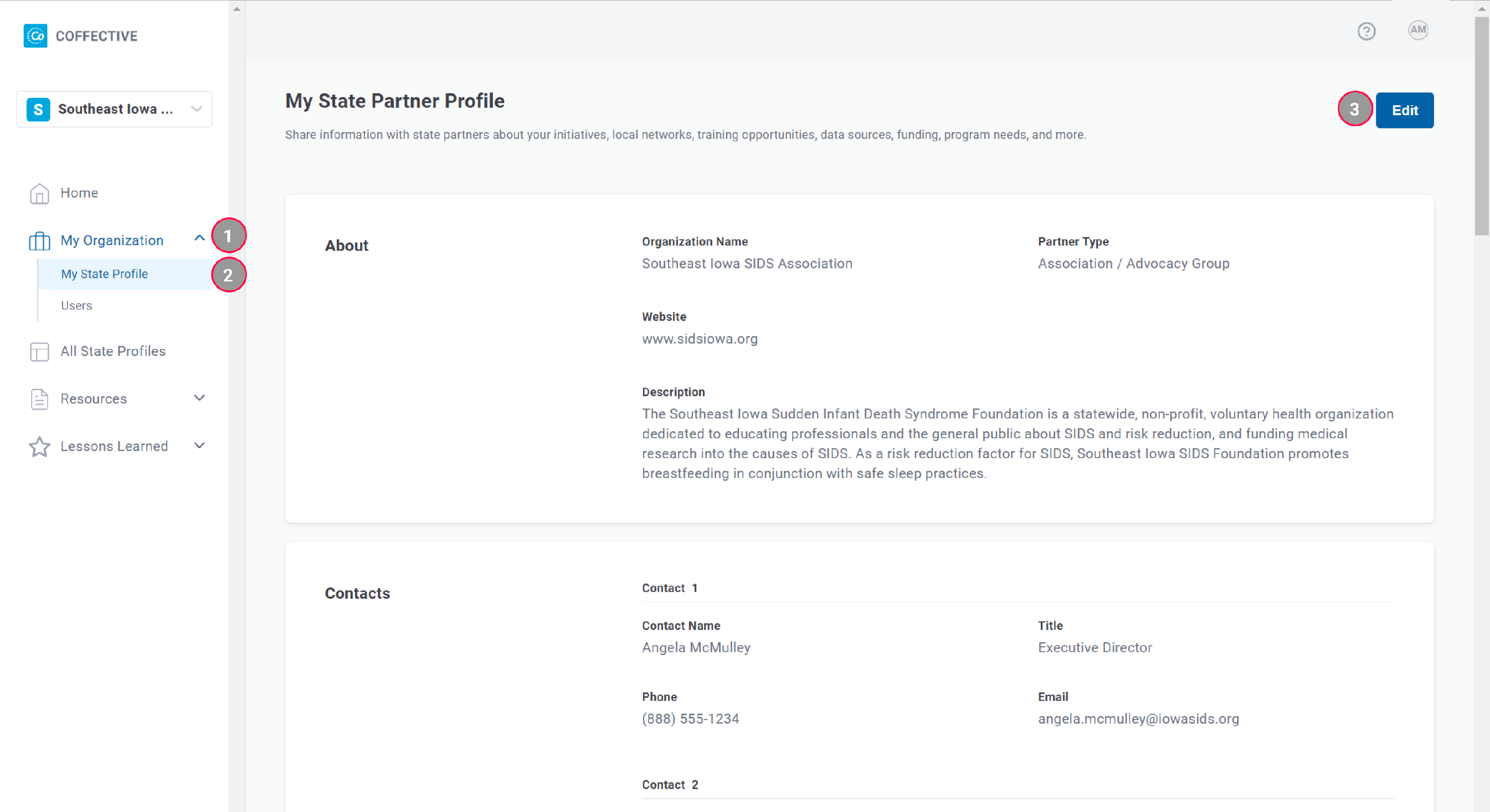Edit - Only Administrators have the ability to edit their state partner profile and will see this button.
