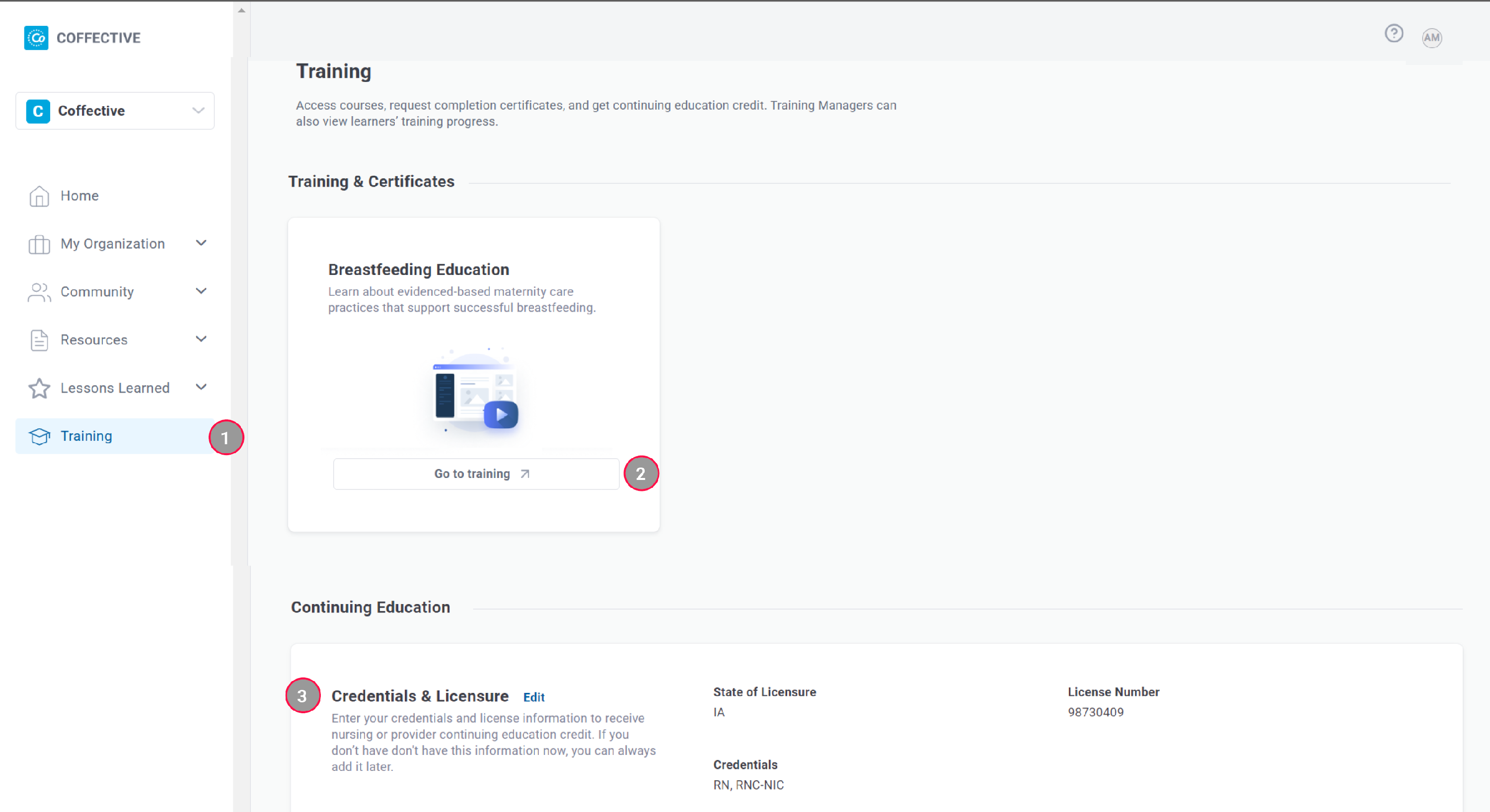 Credentials & Licensure - Enter your credentials and license information at any time. These are required to receive continuing education credit.